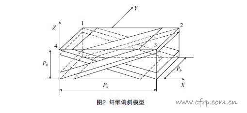 由于編織復合材料的基礎是紡織技術,對三維編織復合材料的研究,首先必須搞清楚紡織物結構的幾何模型[4]。美國是研究編織復合材料最早的國家之一。20世紀80年代比較典型的幾何模型當屬美國編織技術的先驅Frank K. Ko和Tsu-Wei Chou及其合作者最先提出的3 種幾何模型:第1種是Ko和Pastore[5]基于三維編織物中的紗線片段提出的一種單元胞體的“取向平均模型”,第2種稱之為“‘米’字枝狀模型”,Ma和Yang等[6]把四步法編織復合材料的單元胞體結構看成是由3根相互正交的紗線和4根對角紗線所組成,針對這些紗線的相互作用建立了細觀分析模型;第3種是Yang和Ma 等[7]的“纖維傾斜模型”。Yang等以由四步法編織的四向編織復合材料為對象,根據(jù)其預成形件內纖維束的排列為鋸齒形的特點,建立了纖維偏斜模型。認為在單胞內纖維束沿長方體的4個對角線方向排列,在注入基體后形成一個薄的斜板,4個偏斜的單向板形成一個單元,如圖2所示。