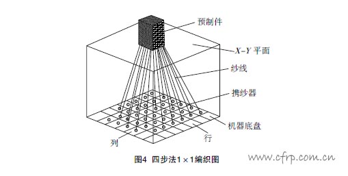 近年來,許多學者對矩形編織材料細觀結構給予了高度的關注,逐步建立了由簡單“米”字型到三維實體的單胞幾何模型,推動著力學模型的發(fā)展。鄭錫濤和葉天麒[13]系統(tǒng)地研究了四步法1×1方型編織工藝編制的預成形件及其增強的復合材料的細觀結構。提出了紗線橢圓形橫截面假設,考慮了編織紗線的細度和編織紗線填充因子的影響,創(chuàng)建了正軸模型。根據(jù)編織過程中攜紗器的運動軌跡特點,將預成形件劃分為三個不同的區(qū)域,分別定義了不同的控制體積單元,識別了編織結構參數(shù)之間的關系,同時給出三維編織復合材料的設計方法,三維編織示意圖見圖4。馮偉和馬文鎖[14]將編織物中連續(xù)的紗線離散開來并用特殊的點符號表達,用點群和空間群分析現(xiàn)有編織材料幾何結構,一方面可以合理地對現(xiàn)有編織材料幾何結構進行描述和分類;另一方面也可以將該理論用于推導編織材料幾何結構新的和更為有效的編織方法。張美忠等[15]由于編織復合材料實際結構的復雜性,為了使研究結果更真實,用現(xiàn)有成熟的有限元軟件仿真三維編織復合材料,并研究其各項力學性能已成為一種趨勢。