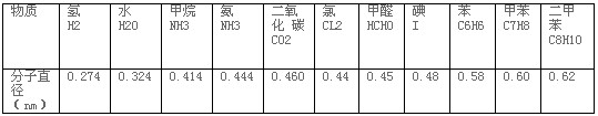 這要從三個方面來說明:第一,孔隙具有吸附勢,靠碳分子與被吸附分子的引力而形成的,孔徑越小,吸附勢越強。第二,分子運動理論:①一切物體均由分子或原子組成,分子(原子)間有間隙;②分子(原子)是處于永不停息漫無規(guī)則的熱運動狀態(tài),分子間相互碰撞很頻繁,在標準狀態(tài)下,甲醛分子的自由運動速度為450m/s,一個甲醛分子與其它分子每秒要碰撞109次/S(幾十億次);若貼近所研究表面的甲醛分子數(shù)密度,時時刻刻與遠處的甲醛分子數(shù)密度相等,則每秒有約2.7×1027個甲醛分子(約130㎏)碰在每平方米面積上;③分子間有相互作用力,一般表現(xiàn)為引力。第三,碰撞分子的直徑與活性炭纖維孔隙直徑要匹配,若分子直徑大于孔隙直徑,則分子碰活性炭纖維時,進不了孔隙而被彈回到空中;若分子直徑遠小于孔隙直徑,則分子即使碰到了孔隙,也有可能跑出來,孔徑越大,跑出來的概率也越大,使吸附率越??;當分子直徑略小于孔徑時,分子碰到孔以后難于跑出來,即被吸附了。被吸附的分子數(shù)量多,表明其吸附能力越強。經(jīng)查實與計算,某些物質(zhì)分子的有效直徑如表1所示: