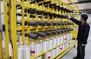工人在碳纖維復(fù)合芯導(dǎo)線生產(chǎn)線上緊張工作。江蘇連云港中復(fù)碳芯電纜科技有限公司是專業(yè)從事碳纖維復(fù)合材料芯導(dǎo)線開發(fā)和生產(chǎn)的企業(yè),第一條碳纖維復(fù)合芯導(dǎo)線生產(chǎn)線目前已經(jīng)成功投產(chǎn),年生產(chǎn)能力達(dá)到2萬公里,填補了碳纖維電纜在國內(nèi)電力領(lǐng)域大規(guī)模應(yīng)用的空白。