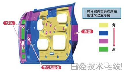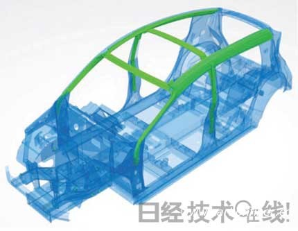 從前柱到天窗側(cè)、天窗強(qiáng)化材料以及中柱的上半部分等(圖中綠色部分),采用了液壓成型材料。