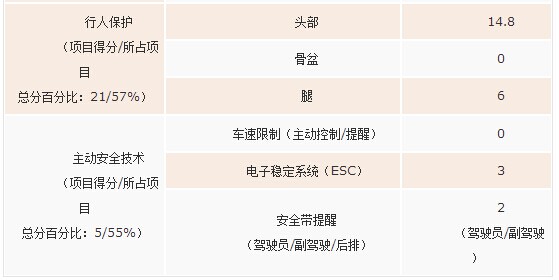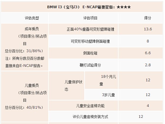 寶馬i3之所只拿到四星的成績(jī),很大程度上都是因?yàn)檫@款車(chē)在行人保護(hù)和主動(dòng)安全系統(tǒng)兩項(xiàng)評(píng)估失分較多,其中,行人保護(hù)測(cè)試中針對(duì)骨盆的評(píng)價(jià)和主動(dòng)安全系統(tǒng)測(cè)試中有關(guān)速度輔助系統(tǒng)的評(píng)估都沒(méi)有得分,這導(dǎo)致兩項(xiàng)測(cè)試的得分均只拿到總分的一半。