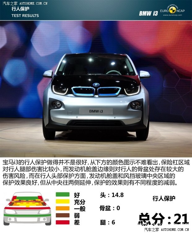 在此之前的測(cè)試,寶馬i3的表現(xiàn)都比較穩(wěn)定,如果這樣的狀態(tài)能夠延續(xù)至行人保護(hù)和主動(dòng)安全系統(tǒng)這兩項(xiàng)測(cè)試中,那么,拿到五星成績(jī)應(yīng)該不成問(wèn)題,下面,我們看看究竟是在哪些細(xì)節(jié)損失了分?jǐn)?shù)。