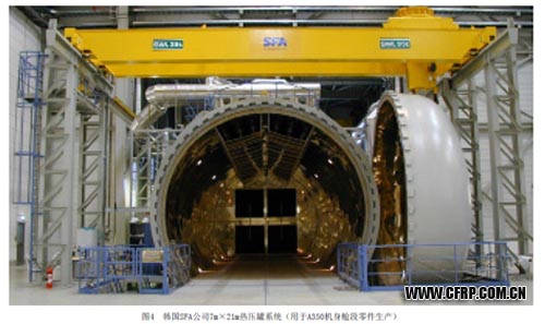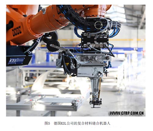 除自動鋪絲/鋪帶機(jī)外,其他一些先進(jìn)的復(fù)合材料自動化加工設(shè)備也廣泛應(yīng)用于波音和空客等主要飛機(jī)制造廠商的最新型號生產(chǎn)中。在復(fù)合材料固化方面,承接空客A350機(jī)身零件生產(chǎn)任務(wù)的德國Premium Aerotech公司采購兩臺韓國SFA公司(原英國Aeroform)公司制造的工作直徑為7m,工作長度為21m的巨型軸流式熱壓罐用于A350前機(jī)身13~14號艙段和后機(jī)身16~18號艙段的生產(chǎn)(圖4),由于采用沿?zé)釅汗揲L度方向排布的自動控制加熱功率的加熱元件和先進(jìn)的基于“動態(tài)熱位差”控制原理的自動控制軟件,罐內(nèi)溫度均勻性和生產(chǎn)效率都得到提高,從而最大限度地保證了A350項(xiàng)目的流暢性。模壓成形方面,波音787的翼梁生產(chǎn)中使用了西班牙SENER公司的裝備自動裝卸模具裝置的熱隔膜成形機(jī)生產(chǎn)C形梁,并使用同一家公司生產(chǎn)的復(fù)合材料自動拉擠成形機(jī)生產(chǎn)用于填補(bǔ)兩C形梁之間三角區(qū)的材料。在復(fù)合材料縫合和編織方面,空客A380巨型客機(jī)的后機(jī)身承壓隔框的生產(chǎn)中,德國KSL公司提供的自動縫合機(jī)器人將多層多軸向碳布進(jìn)行縫合(圖5)[3],以保證各層碳布之間的連接,然后利用先進(jìn)RFI(樹脂膜熔塑)技術(shù)進(jìn)行樹脂浸潤、固化并得到零件[4]。