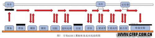 下面以空客A350XWB的機(jī)翼(圖6)翼板桁條生產(chǎn)線為例進(jìn)行說明,德國空客施塔德(Stade)工廠負(fù)責(zé)生產(chǎn)的A350上翼板為空客迄今為止生產(chǎn)的最大的碳纖維復(fù)合材料整體零件,尺寸達(dá)31.6m×5.6m,重量達(dá)2t;其內(nèi)表面安置的長短不一的碳纖維桁條,最長的接近30m,桁條總長度超過300m;并且按照空客的預(yù)想,施塔德工廠的翼板生產(chǎn)將來必須滿足每月生產(chǎn)7~13架A350客機(jī)的效率要求。