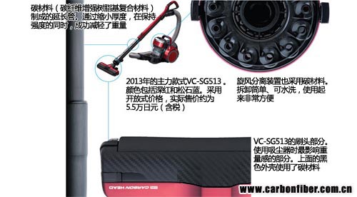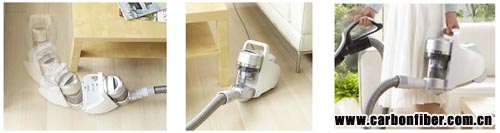 碳材料應用到了刷頭罩、延長管、旋風分離裝置3個部位。與使用碳材料之前的款式相比,延長管與刷頭相加,重量減輕了約300克。再加上采用小直徑喉管,喉管、延長管、刷頭的總重量減輕了500克左右,約占總重量的25%。
