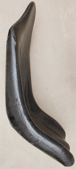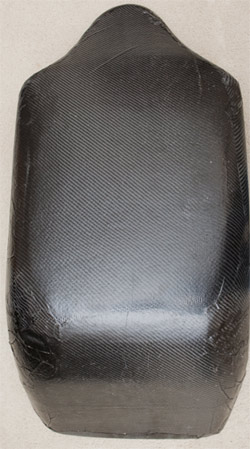 A couple days later, we returned to un-wrap the seat and trim the overhanging edges. Figure 6 shows the part right out of the vacuum bag. The vacuum bag was saved for use with the front layers. Using a box cutter, the extra carbon was easily trimmed off.