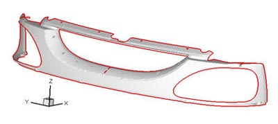 由于SMC在模腔中流動過程是一個非線性的多場耦合問題,一方面模壓料在模壓過程中變形相當大;另一方面模壓料的粘度隨應變速率、溫度和樹脂固化度的可變性,使得其本構(gòu)關(guān)系是非線性的。因此擬采用分步計算的方法,通過控制體有限元法來描述模壓料的流動狀況,而模壓過程中的樹脂流動問題是一個具有運動邊界的非穩(wěn)態(tài)過程。為了解決這一問題,我們將模壓過程作為一系列準穩(wěn)態(tài)的瞬間解的組合。在每一時間步,當壓力場確定后,速度場可通過動量方程計算得到,新的流動前鋒的位置可由流動前鋒的速度分量和時間增量來估算。與壓力場的求解相類似,溫度場和轉(zhuǎn)化率可根據(jù)當前的速度場來確定。由計算所得的溫度和轉(zhuǎn)化率則用于更新粘度,新的粘度值重新用于計算壓力場,溫度場和轉(zhuǎn)化率計算,重復這一過程直至整個模腔充滿,以汽車面罩產(chǎn)品為例: