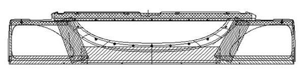 通過引入計算機模擬這一過程將使材料的流動方向和流動時間可視化,從而指導鋪層設(shè)計,確定前期對產(chǎn)品的工藝設(shè)計的方向,其基本的原理為:設(shè)SMC模壓流動時為不可壓縮的流體,結(jié)合動量、能量、質(zhì)量守恒方程,得到SMC模壓流動的控制方程。其控制方程包括壓力分布方程、熱傳導方程和固化反應動力學方程等。對于薄殼件流動,如果假設(shè)模具表面沒有滑移;流動中的主應力是剪應力。