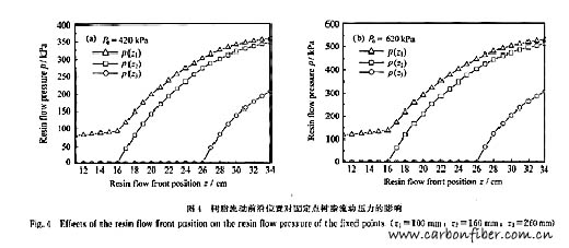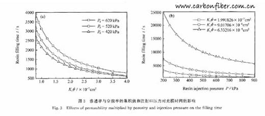 利用復(fù)化辛卜生數(shù)值積分算法和Fortran 99算法語言,對所推導(dǎo)的理論方程(8)、(9)和(11)進(jìn)行編程和數(shù)值計(jì)算。由方程(11)可知,在樹脂粘度保持恒定及樹脂流動(dòng)前沿位置固定的R丁M充模工藝條件下,注射口壓力和三維編織變截面薄壁殼體預(yù)制件滲透率與空隙率(婦的乘積值確定了樹脂充模溢流時(shí)間的大小。圖3(a)表示在不同注射口壓力條件下滲透率與空隙率的乘積值對樹脂充模溢流時(shí)間的影響。圖3(b)表示在不同的滲透率與空隙率的乘積值條件下注射口壓力大小對樹脂充模溢流時(shí)問變化規(guī)律的影響。圖4表示在注射r1壓力分別為420 kPa和620 kPa的恒壓條件下,三個(gè)固定位置上(z=100 mm,z2=160 min、=260 mm)壓力理論值p(z1)p(z2)和p(z3)與樹脂流動(dòng)前沿位置對應(yīng)關(guān)系曲線。山圖4可知,樹脂飽和浸潤區(qū)」或內(nèi)固定點(diǎn)壓力隨樹脂流動(dòng)前沿位置遞增而增大。