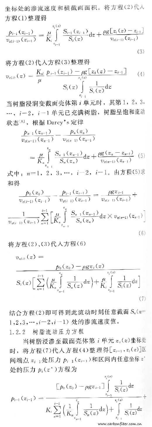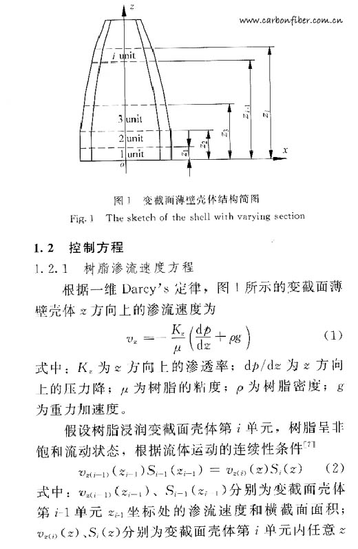 RTM充模的實(shí)質(zhì)是液體樹脂飽和充滿纖維預(yù)制件孔隙并排除其內(nèi)部所含空氣的過程??紤]到三維整體編織變截面薄壁殼體的厚度與其直徑和高度相比,數(shù)量級較小,且薄壁殼體KTM模具樹脂流道的設(shè)計(jì)一般采用環(huán)線注射結(jié)構(gòu)方式,因此樹脂充模過程中的流動(dòng)規(guī)律可近似為多孔介質(zhì)中的一維滲流,即在柱面坐標(biāo)系統(tǒng)(廠,夕,z)中,壓力和速度值僅沿z方向變化。分段一集合計(jì)算方法是根據(jù)制件截面形狀方程的種類數(shù),沿軸線將殼體分成若干單元.利用Darcy分鐘定律依次計(jì)算出各單元段內(nèi)樹脂流體的運(yùn)功狀態(tài)參數(shù),經(jīng)過數(shù)學(xué)變換,求得變截面薄壁殼體內(nèi)不同位置的樹脂流動(dòng)速度場、壓力場、位移場和充模時(shí)間的分布規(guī)律。為簡化薄壁殼體樹脂流動(dòng)的理論分析與計(jì)算,作如日限設(shè):充模過程中三維編織頂制件不會(huì)發(fā)生纖維移動(dòng)和變形;充模過程中不考慮由于化學(xué)反應(yīng)所引起的粘度變化,樹脂的粘度值為一定值;充模過程中僅考慮宏觀樹脂流動(dòng)現(xiàn)象.慣性和毛細(xì)作用忽略不計(jì);樹脂注人壓力為Po(zo)。行流動(dòng)前沿處壓力為0. 本文來自123