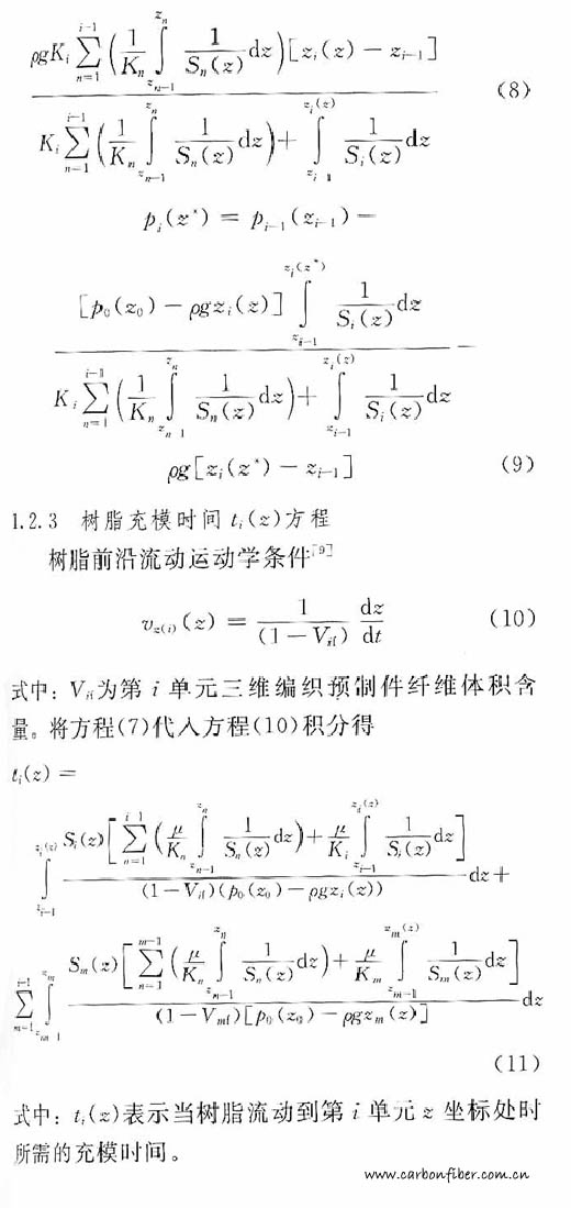 (3)對于加工特定結(jié)構(gòu)的三維編織變截面薄壁殼體復(fù)合材料制件,借助于方程(7)、(8)、(9)和(11)的理論頂測結(jié)果,可合理設(shè)計(jì)RTM充模工藝參數(shù)。