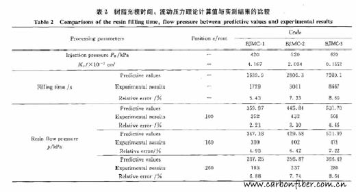 值取決于樹脂流動(dòng)前沿位置和注射日壓力的大小。為了驗(yàn)證所提出的三維編織變截面薄壁殼體RTM工藝樹脂充模流動(dòng)分段一集合理論計(jì)算方法的正確性,對表1所示的三種規(guī)格的三維編織變截面薄壁殼體進(jìn)行了RTM充模試驗(yàn)。試驗(yàn)選用TDE-85/DDS/BF,乙胺環(huán)氧樹脂體系,以100:15:1.5的質(zhì)最比例混配成所需的膠液,在35分鐘C經(jīng)測試,樹脂粘度為428.6 mPa·s(樹脂粘度測試標(biāo)準(zhǔn)為GB7193-1),固化后其澆注體密度為1. 302 g/crn分鐘(密度測試標(biāo)準(zhǔn)為GB 1033-70)。為準(zhǔn)確測量樹脂充模溢流時(shí)間,本試驗(yàn)中采用透明有機(jī)玻璃材料加工RTM模具出料口端蓋,并且在模具內(nèi)部相應(yīng)的位置點(diǎn)上安裝壓力傳感器以測量樹脂溢流后固定位置上的樹脂流動(dòng)壓力。樹脂充模溢流時(shí)間理論計(jì)算值與實(shí)測結(jié)果的比較、三個(gè)固定位置上樹脂流動(dòng)壓力理論計(jì)算值與實(shí)測結(jié)果的對比如表2所示。由表2所列樹脂充模溢流時(shí)間理論計(jì)算值與實(shí)測值的比較值可知:當(dāng)K矛值較大時(shí),樹脂充模溢流時(shí)間理論計(jì)算值具有較高的預(yù)測精度場K淤值逐漸減小時(shí),樹脂充模溢流時(shí)問逐漸增大,并且理論計(jì)算值與實(shí)測值的相對誤差逐漸增大,這主要是由于過長的充模時(shí)間引起樹脂粘度增加所致。 123456