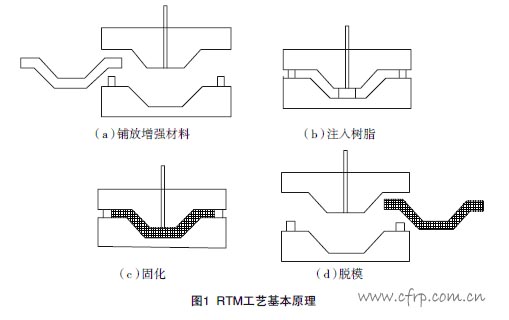 RTM成型工藝是先在模腔內(nèi)預(yù)先鋪放增強(qiáng)材料預(yù)成形體,芯材和預(yù)埋件,然后在壓力或真空作用力下將樹脂注入閉合模腔,浸潤(rùn)纖維,固化后脫模,再進(jìn)行二次加工等后處理工序,其基本原理如圖1所示。