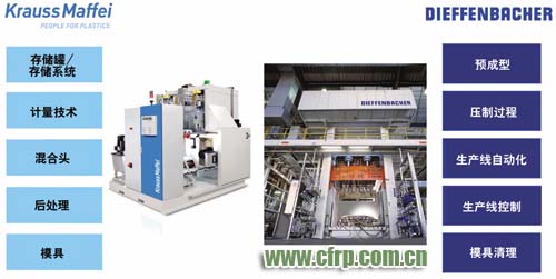德國加工機(jī)械領(lǐng)域的專家迪芬巴赫公司(Dieffenbacher)和克勞斯瑪菲公司(KraussMaffei)在RTM技術(shù)領(lǐng)域展開了合作,他們對以上的市場需求做出了響應(yīng)——開發(fā)了一條高壓樹脂傳遞模塑成型工藝(HP-RTM)的自動化生產(chǎn)線。這條生產(chǎn)系統(tǒng)包括了預(yù)成型加工、壓制過程,以及修整工藝。相比于傳統(tǒng)的RTM工藝,該HP-RTM工藝減少了樹脂注射次數(shù),提高了預(yù)制件的浸漬質(zhì)量,并縮短了成型周期。