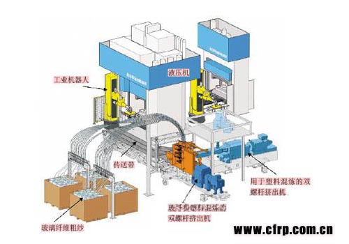 在這種工藝方案中,第一臺雙螺桿擠出機將塑料粒料和添加劑熔融混合,并擠出到第二臺雙螺桿擠出機中。第二臺擠出機將玻纖切斷,并與塑料熔體混合均勻,擠成約200~300mm寬的條形料。條形料通過帶有加熱功能的傳送帶向前輸送,并由工業(yè)機器人抓取后送至模具中進(jìn)行模壓成型。