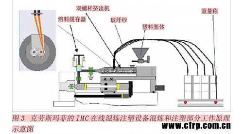 克勞斯瑪菲公司開發(fā)的在線配混注塑成型設(shè)備(其工作原理如圖3所示)為LFT工藝的實現(xiàn)提供了一種新的方法。該設(shè)備將雙螺桿混煉機和克勞斯瑪菲的標(biāo)準(zhǔn)MC塑料注塑機組合,實現(xiàn)了原料在線直接混煉。這種混煉-注塑方法具有更多優(yōu)勢: